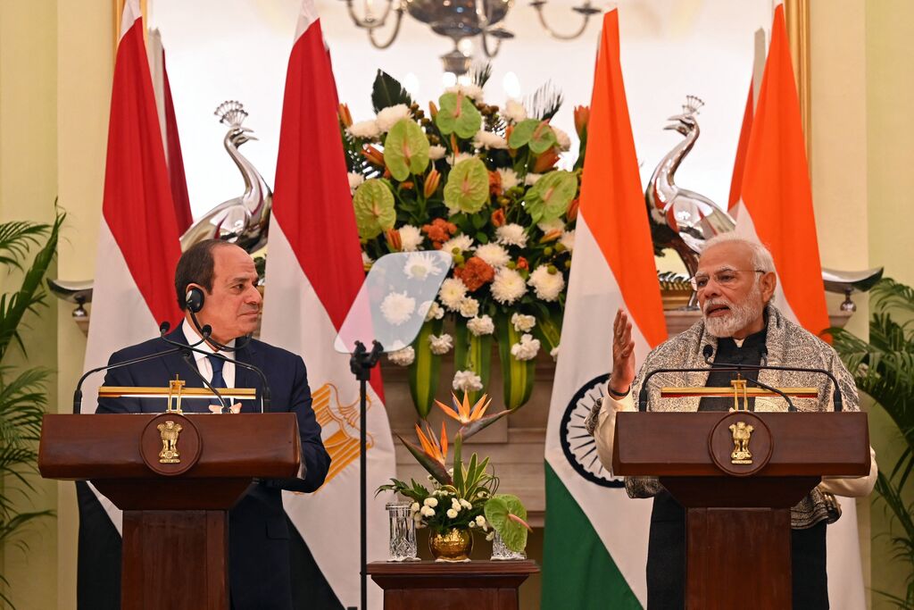 | Le président égyptien Abdel-Fattah al-Sissi (gauche) et le Premier ministre indien Narendra Modi, lors d'un événement en Inde en janvier 2023. |