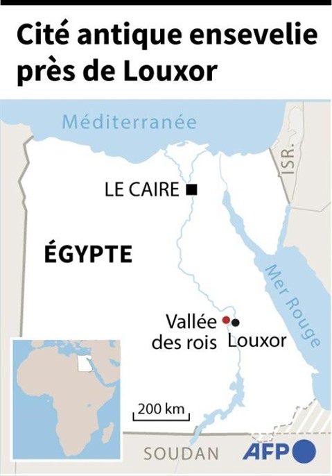 | Carte d'Égypte localisant la ville antique ensevelie découverte près de Louxor. |