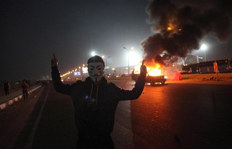 | Une voiture en feu et un homme portant un masque des Anonymous lors de violences devant un stade du Caire, le 8 février. |