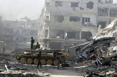 | Des forces syriennes dans une rue détruite du campa palestinien de Yarmouk repris au groupe jihadiste État islamique (EI), le 21 mai. |