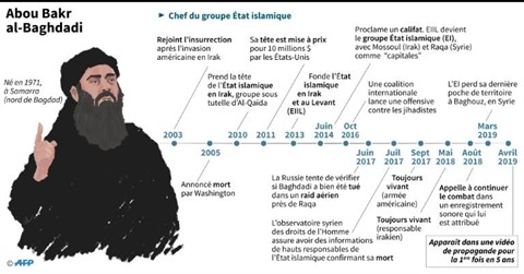 De son côté, la coalition internationale antijihadistes dirigée par Washington essaye toujours de "corroborer de façon indépendante la validité de la vidéo", a-t-elle indiqué. Le département d'État américain a promis que la coalition poursuivrait son combat pour que "tous les dirigeants (de l'EI) qui restent soient traduits en justice". Autoproclamé en 2014 par Abou Bakr al-Baghdadi sur de vastes territoires en Irak et en Syrie, le "califat" a été déclaré éradiqué le 23 mars au terme d'une offensive de combattants arabes et kurdes soutenus par la coalition internationale.