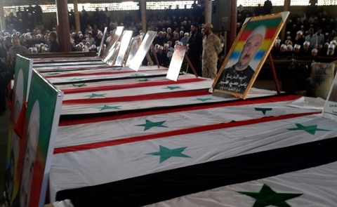 | Les cercueils de certaines victimes des attaques commises le 25 juillet par l'EI, lors de funérailles le 26 juillet dans la ville de Soueida, dans le Sud de la Syrie. |