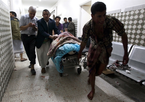 | Un blessé transporté à l'hôpital de Sanaa après un double attentat contre une mosquée chiite, le 2 septembre |