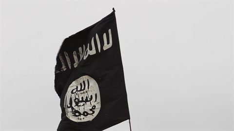 | Un drapeau du groupe État islamique sur le point d'être enlevé par des combattants chiites irakiens, dans le désert irakien de Samarra, le 3 mars 2016. |