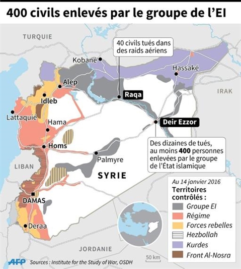 En outre, 270 des 400 civils enlevés samedi 16 janvier par l'EI dans la région de Bgheliyeh ont été libérés le 19 janvier. Il s'agit surtout de femmes, d'enfants et de personnes âgées qui ont été relâchés après avoir été interrogés par l'EI sur leurs éventuels liens avec le régime, selon l'ONG.