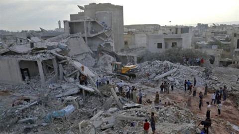 | Des Syriens devant des maisons détruites dans la province syrienne d'Idleb, le 8 juin 2018. |