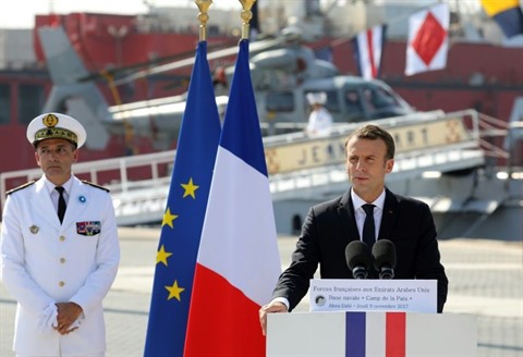 | Le président français Emmanuel Macron lors d'une visite aux forces françaises sur une base navale à Abou Dhabi le 9 novembre. |