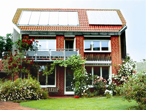 | Le toit de la maison et le balcon sont couverts de panneaux solaires. |