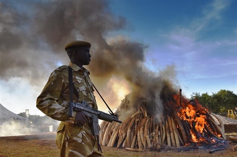 | Un garde de sécurité aux côtés de 15 tonnes d'ivoire d'éléphant brûlés au sein du Parc national de Nairobi au Kenya, le 3 mars |