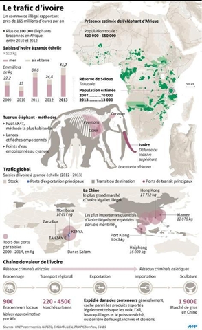 | Chiffre du commerce d'ivoire, carte de la population d'éléphants en Afrique et schéma de distribution de l'ivoire dans le commerce international. |