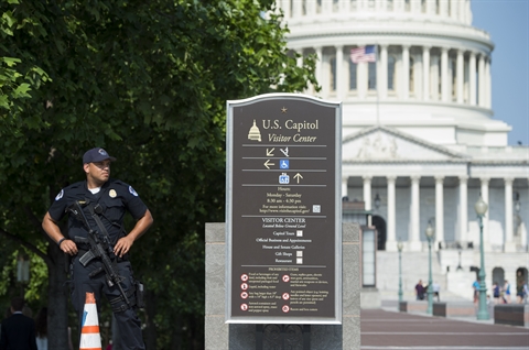 | Un agent de la police monte la garde, le 14 juin au Capitole, à Washington. |