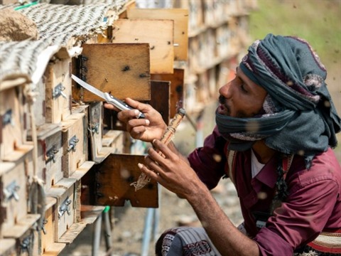 Dans la vallée au pied de Taëz, ville du Sud-Ouest du pays entourée de montagnes et particulièrement affectée par le conflit, Mohammed Saif inspecte ses ruches. Il en comptait 300 avant la guerre. Elles ne sont plus que 80 aujourd'hui.