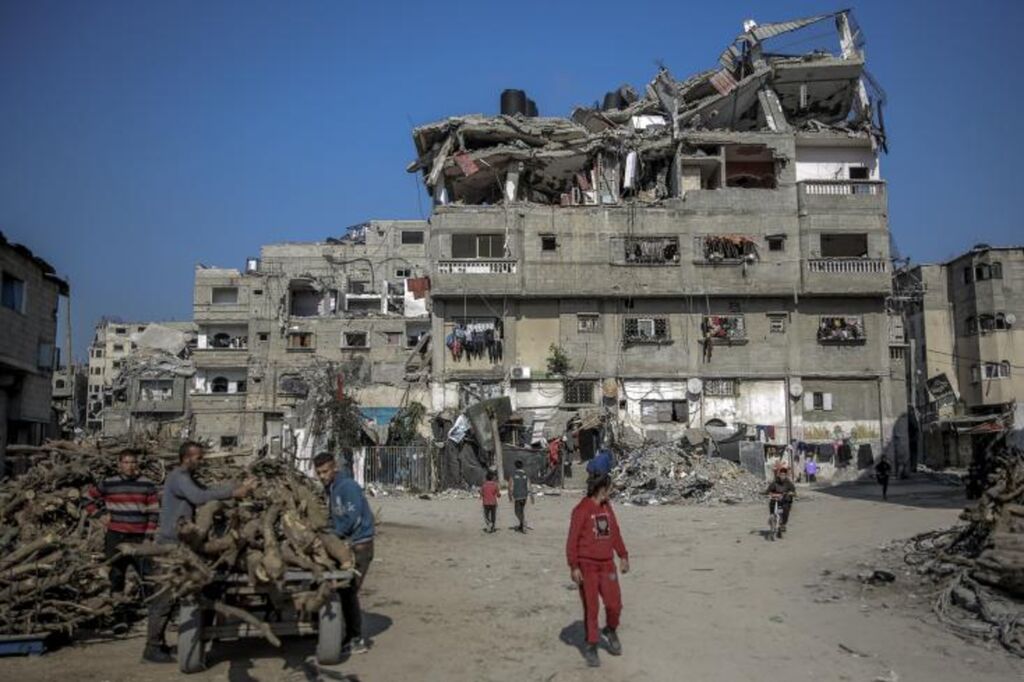 | Des Palestiniens entassent du bois près d'un immeuble détruit lors de frappes israéliennes, le 26 février à Beit Lahia dans la bande de Gaza. |