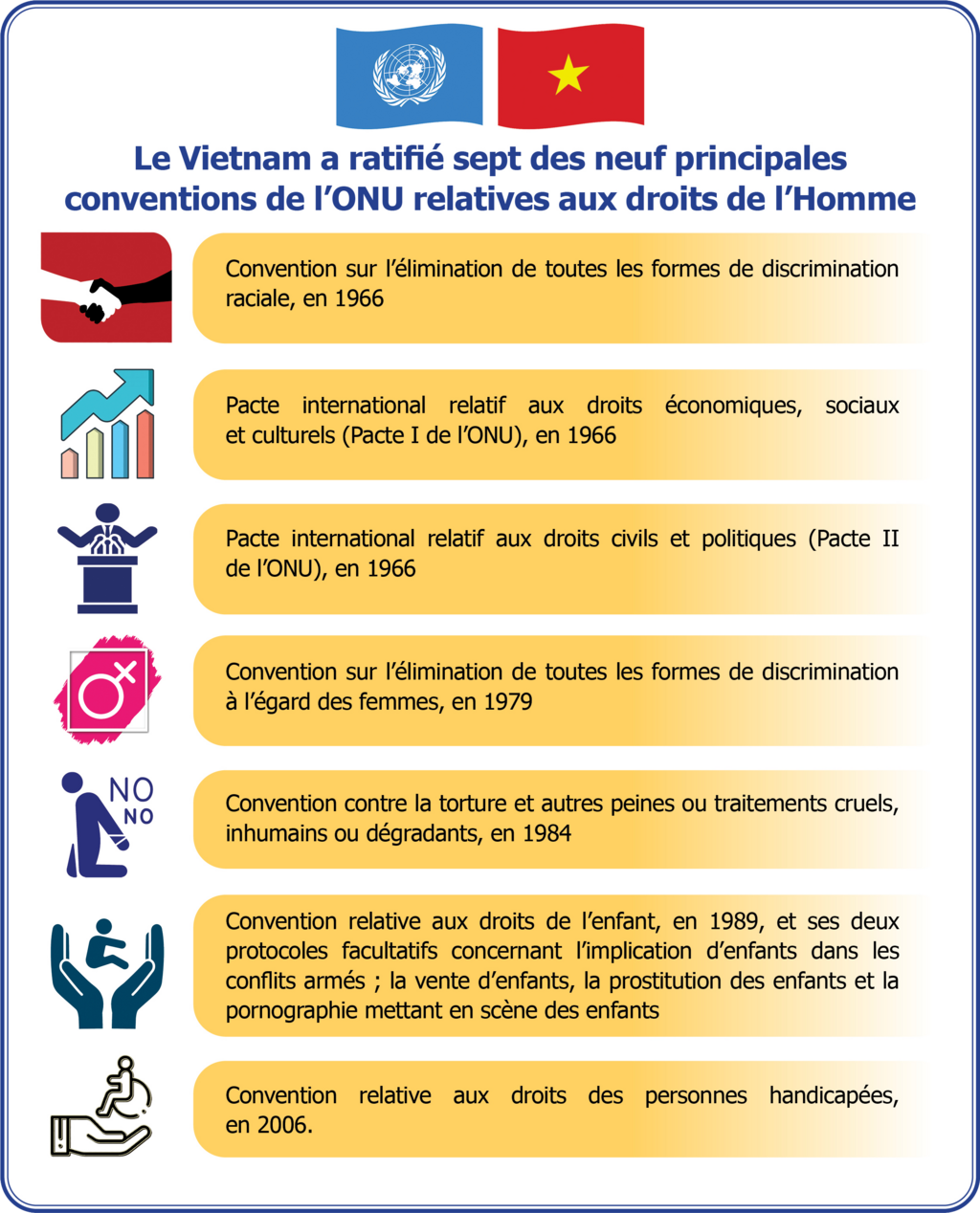 Dans l’optique de contribuer davantage et plus efficacement aux efforts internationaux visant à renforcer et protéger les droits humains, le Vietnam a fait acte de candidature au Conseil des droits de l’homme pour 2023-2025. Il avait été choisi pour représenter l’Association des nations de l’Asie du Sud-Est (ASEAN) à ce conseil, ce qui, d’après le quotidien européen Times of Malta, prouve la pertinence de sa politique en la matière.