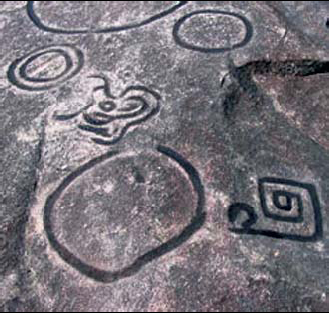 | Des gravures à la surface des blocs rocheux. |