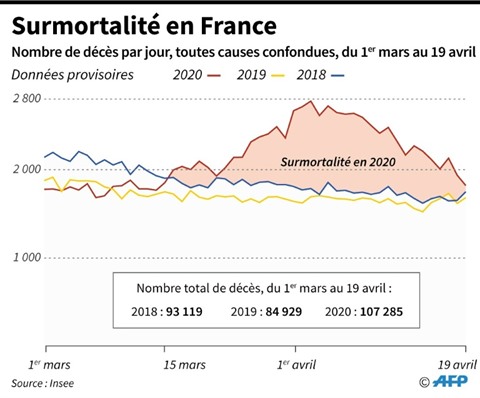 | Surmortalité en France, selon des données provisoires de l'Insee, du 1er mars au 19 avril. |
