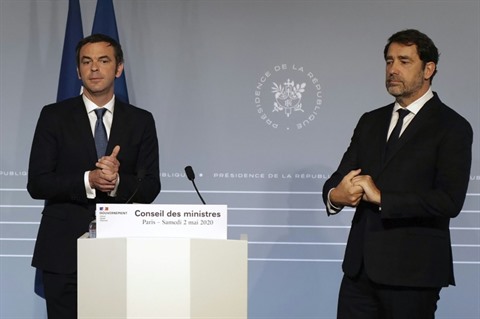 | Les ministres de la Santé, Olivier Véran (gauche), et de l'Intérieur, Christophe Castaner, à Paris le 2 mai. |