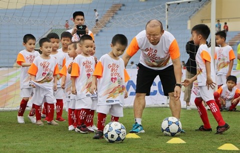 | L’entraîneur en chef de la sélection nationale de football du Vietnam, Park Hang-seo, avec des enfants. |