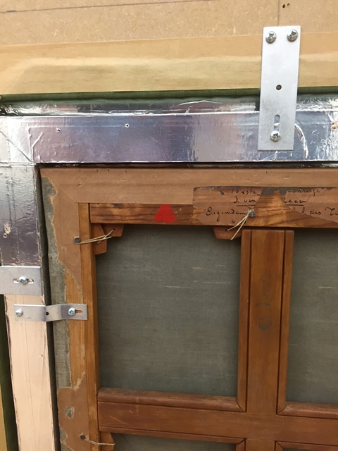 Le mot «Joconde» griffonné en noir au dos de Mona Lisa, à côté de flèches indiquant le sens du tableau. Le triangle rouge colorié sur le cadre de certaines peintures des maîtres néerlandais, signe qu’il fallait sauver celles-ci en priorité en cas de guerre. Ou encore la mosaïque d’autocollants pavant la face cachée des Fumeurs de Fernand Léger.