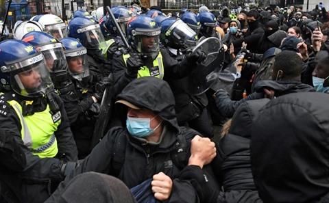 | Des manifestants, certains équipés de masques, face à des policiers non loin de Downing Street le 6 juin lors d'une manifestation contre le racisme. |