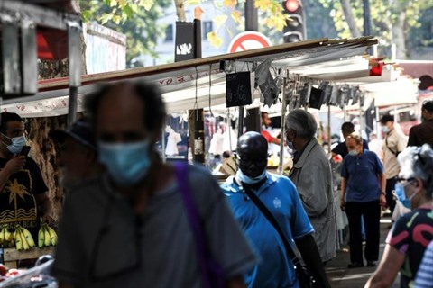 | Des personnes portent un masque de protection au marché Ornano dans le 18e arrondissement de Paris, le 11 août |