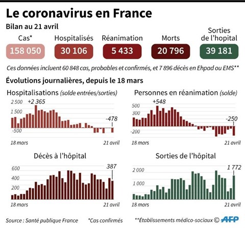 "À partir du 11 mai nous serons en mesure et en obligation de tester toute personne symptomatique ou personne contact", a-t-il martelé plus tard devant l'Assemblée nationale, résumant cette stratégie par le triptyque : "test, isolement, traitement". En attendant, le bilan de l'épidémie atteint 20.796 morts, dont 531 enregistrés en 24 heures, selon le Directeur général de la santé, Jérôme Salomon.