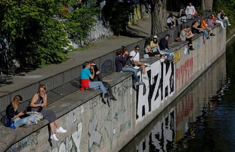 | Des promeneurs le long d'un canal à Berlin, le 18 avril. |