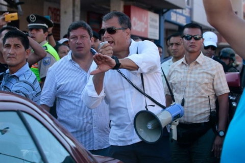 | Le président Rafael Correa en visite le 19 avril à Montecristi après le séisme en Équateur. |