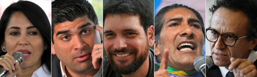 | Les candidats à la présidentielle en Équateur. De gauche à droite : Luisa Gonzalez, Otto Sonnenholzner, Jan Topic, Yaku Perez et Christian Zurita. |