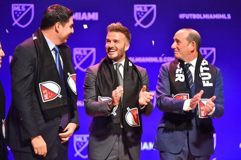 | David Beckham, entouré par le patron de la MLS Don Garber (droite) et l'homme d'affaires Marcelo Claure lors de la présentation de son projet à Miami, le 29 janvier. |