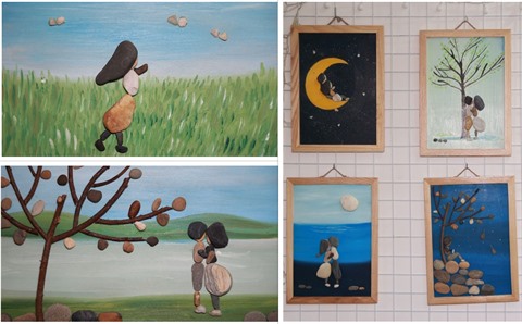 "Dans le processus de création, la chose la plus difficile est de rechercher des cailloux de tailles et de formes qui conviennent à chaque œuvre. Par exemple, des galets adaptés pour reproduire des cheveux, des visages, la forme du corps, etc, confie-t-elle. Les peintures que je réalise portent sur des thèmes aussi divers que la famille, les couples amoureux, le voyage. Mes créations sur le thème de la famille représentant trois, quatre, voire six membres, sont les plus prisées".
