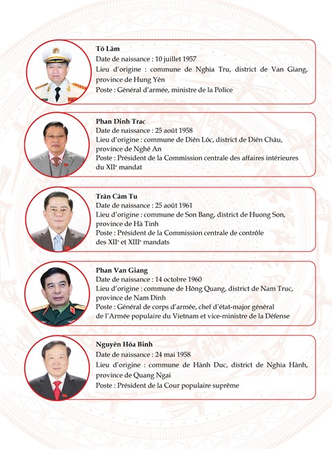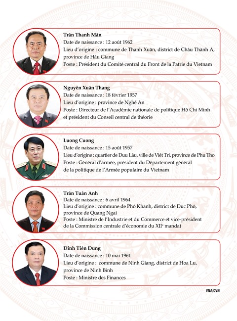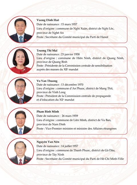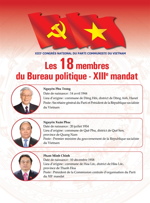 Voici la liste des 18 membres du Bureau politique du Parti communiste du Vietnam (PCV) du XIIIe mandat qui ont été élus lors du 1er plénum du Comité central du PCV du XIIIe mandat, tenu le 31 janvier à Hanoï.