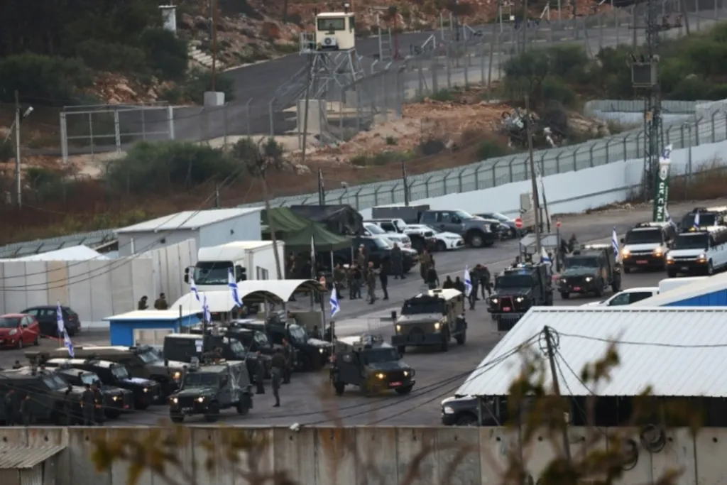 | Véhicules militaires israéliens devant la prison d'Ofer, en Cisjordanie occupée, avant la libération de prisonniers palestiniens, le 13 octobre. |