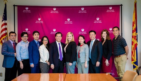 | L'ambassadeur Hà Kim Ngoc (5e à partir de la gauche) et les représentants de la ville de Phoenix prennent une photo de famille. |