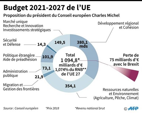 Les 27 vont devoir s'entendre sur le niveau du budget, de l'ordre de 1.000 milliards d'euros, qui sera de toute façon inférieure au précédent CFP (cadre financier pluriannuel de 2014-2020) et sur sa ventilation (agriculture, aides aux régions les plus défavorisées, lutte contre le changement climatique, numérique...).