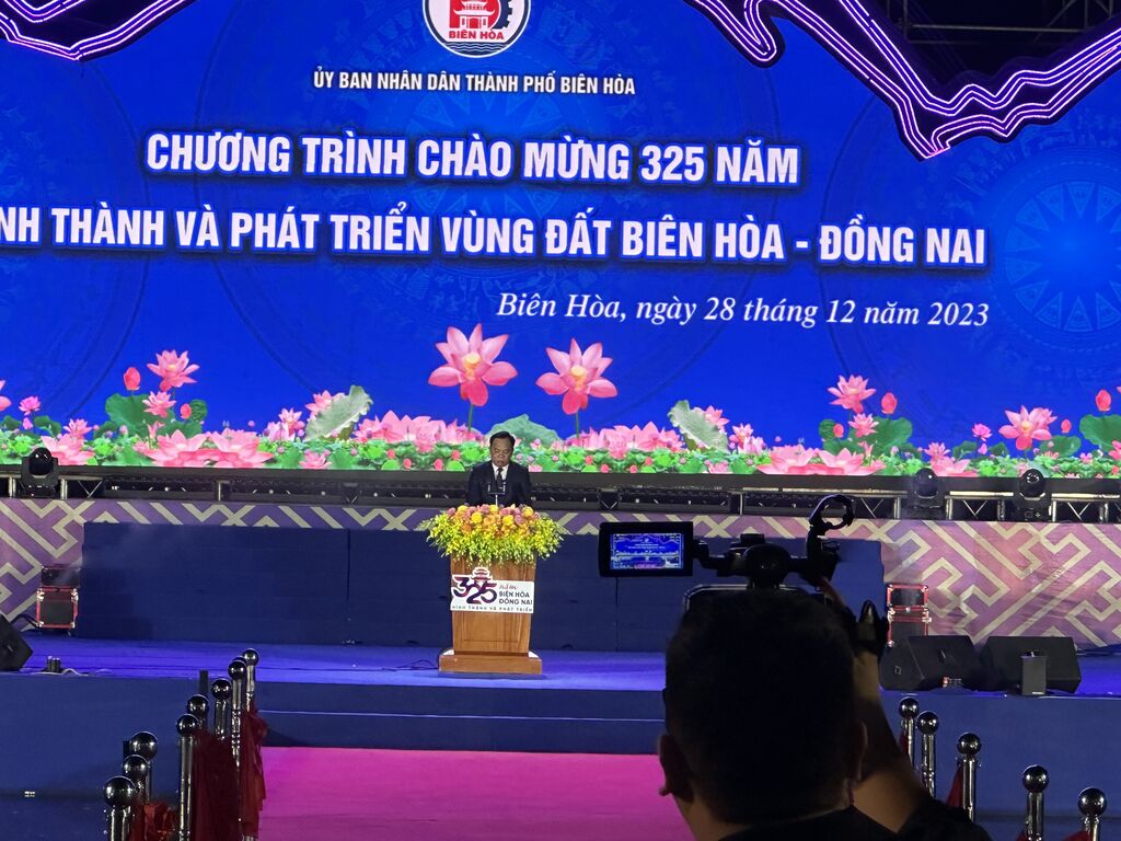 | Vo Tân Duc, président par intérim du Comité populaire de la province de Dông Nai, prononce son discours lors de la soirée dédiée aux 325 ans de création et de développement de Biên Hoà - Dông Nai. |