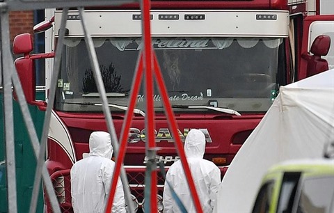 | Des policiers légistes devant le camion frigorifique dans lequel 39 corps ont été découverts, le 23 octobre à Grays, près de Londres. |