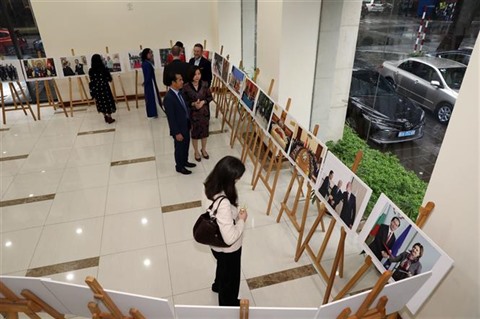 | Des visiteurs à l'exposition de photos célébrant le 70e anniversaire des relations diplomatiques entre le Vietnam et la Bulgarie. |