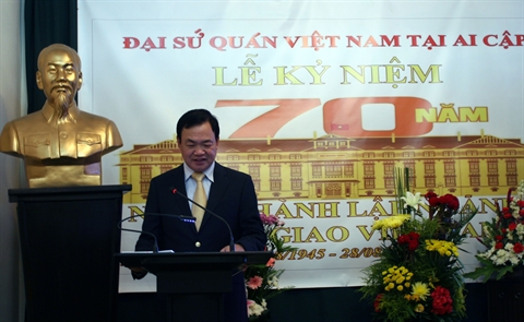 | Cérémonie sur le 70e anniversaire de la diplomatie vietnamienne, le 28 août, à l’ambassade du Vietnam en Égypte. |
