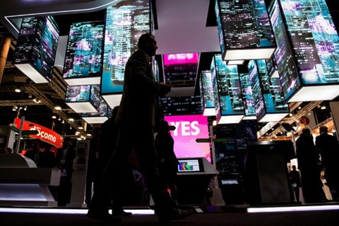 | Dans les couloirs du Congrès mondial des télécoms MWC à Barcelone, le 28 février. |