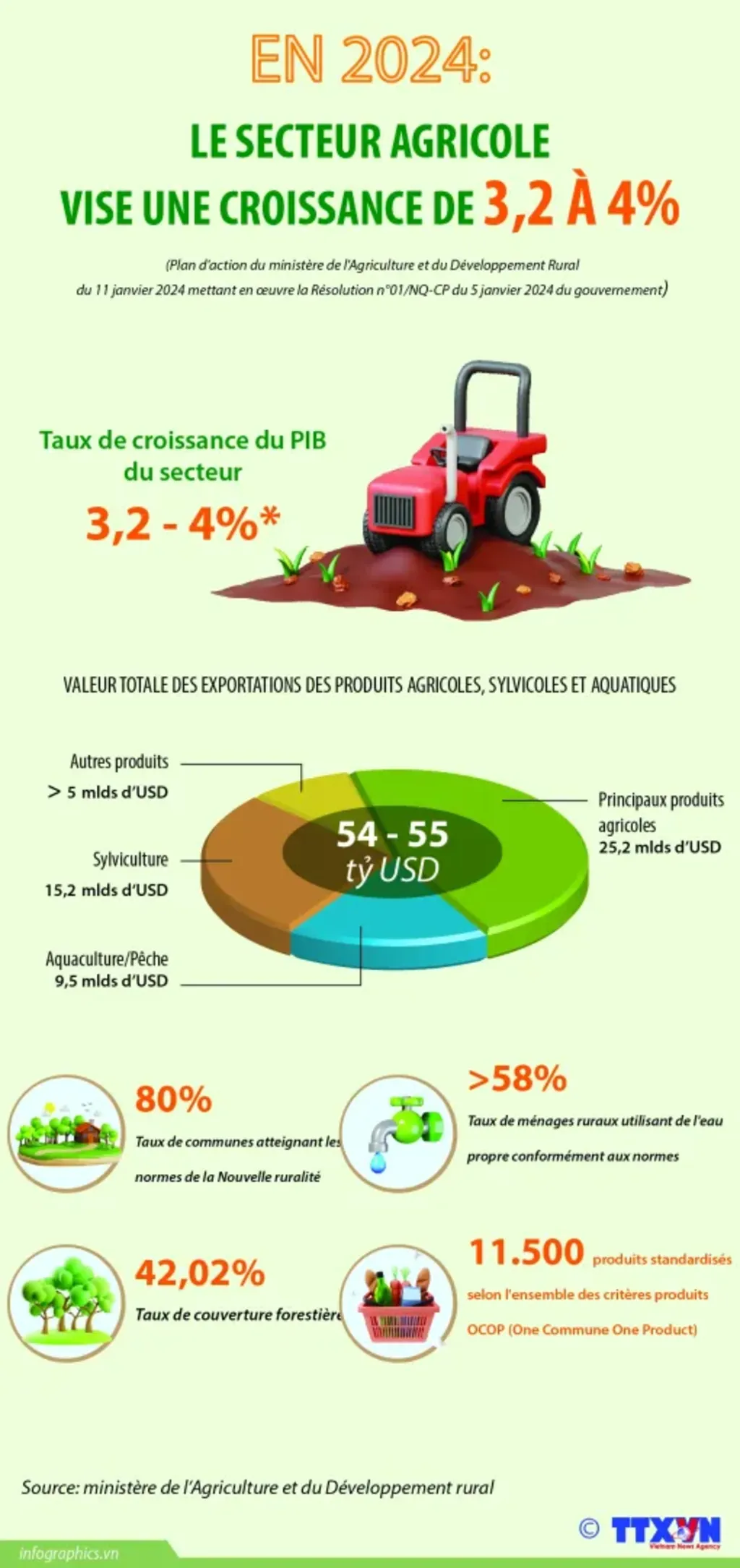En 2023, le PIB du secteur agricole a connu une croissance de 3,83%, soit le taux de croissance le plus élevé de ces dix dernières années. Le chiffre d'affaires total des exportations de produits agricoles, sylvicoles et aquatiques a atteint 53 milliards de dollars. Au cours des cinq premiers mois de cette année, le chiffre d'affaires total des exportations de ces produits est estimé à 24,14 milliards d'USD, en hausse de 21% en un an.