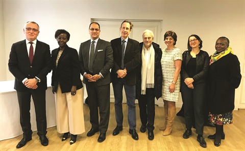 | La secrétaire générale Louise Mushikiwabo (2e à gauche) en compagnie des différents acteurs de la Francophonie, le 13 février à Paris. |