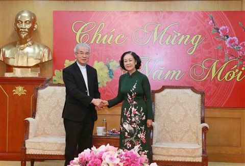 | La cheffe de la Commission de mobilisation des masses du Comité central du Parti, Truong Thi Mai et le prêtre Trân Xuân Manh, le 5 février à Hanoï. |
