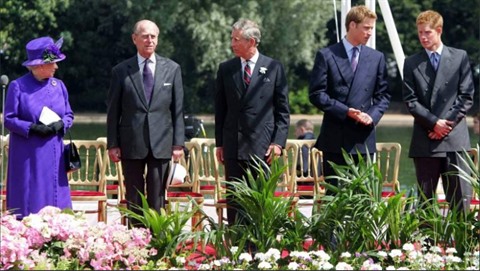 | De gauche à droite, la reine Elizabeth II, le prince Philip, leur fils Charles et leurs petits-fils William et Harry, à Londres, le 6 juillet 2004. |