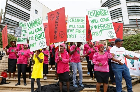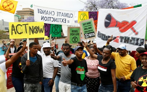 | Des manifestants rassemblés à l'initiative du mouvement écologiste Extinction Rebelliona, le 11 octobre 2019 à Pretoria, en Afrique du Sud. |