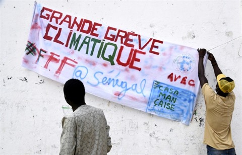 | Un manifestant accroche une banderole "Grande grève climatique" à l'occasion de la mobilisation pour le climat, le 20 septembre 2019 à Thiès, au Sénégal. |