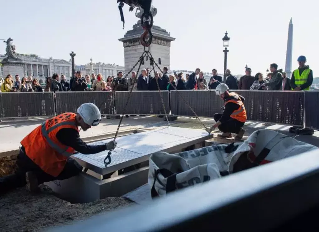| Des ouvriers installent des équipements électriques sur la place de la Concorde à Paris le 19 avril 2023 en vue des JO-2024. |