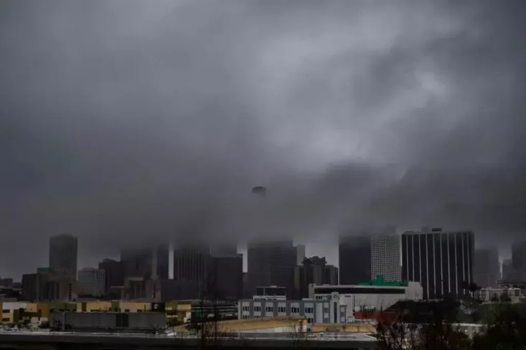 | Nuages noirs et fortes pluies sur le centre-ville de Los Angeles, le 24 décembre en Californie. |