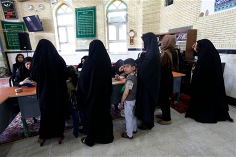 | Des femmes iraniennes dans un bureau de vote de Robat Karim, le 29 avril, à l'occasion du deuxième tour des élections législatives en Iran. |