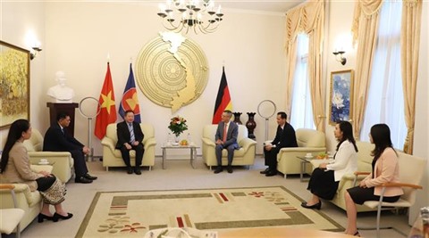 | L'ambassadeur du Vietnam en Allemagne, Vu Quang Minh (4e à droite), reçoit son homologue laotien en Allemagne, Phomma Boutthavong (3e à gauche), le 1er septembre. |